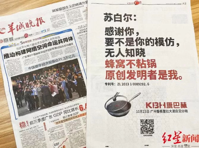2019年10月21日,康巴赫在《羊城晚报》刊登整版广告,内容为“苏白尔:感谢你,要不是你的模仿,无人知晓蜂窝不粘锅原创发明者是我”。广告中还附有二维码链接,扫描后可以看到康巴赫的正式声明:“我公司发现浙江苏泊尔股份有限公司在未经授权的情况下,盗用康巴赫‘蜂窝不沾专利技术’并仿造、销售侵权产品,严重损害了康巴赫的合法权益”、“其他厂商或个人,生产、推广、销售含有‘蜂窝不粘专利技术’的产品,均已构成侵权”……