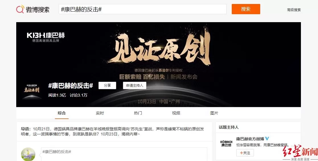 同时在新浪微博上,超过30位大V发布包含“#康巴赫的反击#”、“#感谢你苏先生#”的话题,并配上诋毁苏泊尔的九宫格图片,称苏泊尔在模仿康巴赫的锅,宣称康巴赫才是原创。相关话题阅读量过亿。