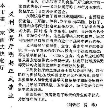 1984年4月20日,北京第一家西式快餐“义利快餐厅”,在北京西单的西绒线胡同西口挂牌开张。