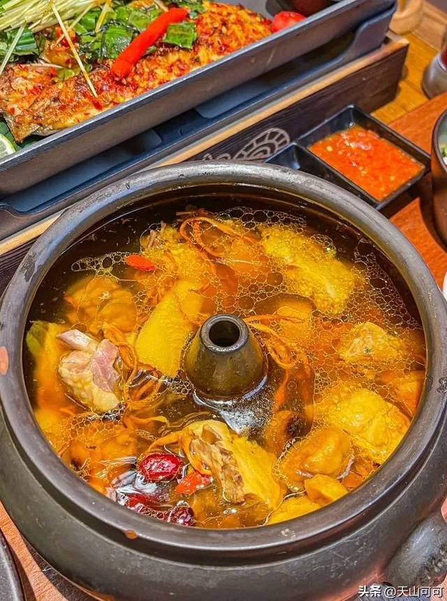 七、云南汽锅鸡:蒸汽凝结的滇味精华起源于乾隆年间的汽锅鸡,凭借特制陶器“汽锅”创造烹饪奇迹。鸡肉与宣威火腿片在蒸汽循环中形成原汁原汤,加入三七、天麻等药材形成滋补药膳。1972年尼克松访华时在昆明品尝后,称其为“东方的魔法汤”。这种不用加水、全靠蒸汽凝液的烹调方式,展现了云南人“器为食之父”的饮食智慧,现已被列入国家级非遗保护名录。
