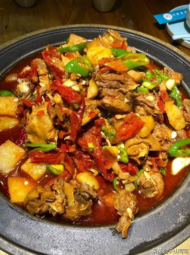 八、新疆大盘鸡:丝绸之路的豪放馈赠20世纪80年代诞生于新疆沙湾县的大盘鸡,是多元文化交融的产物。整鸡切块与土豆、青红椒爆炒,配以安集海辣皮子和皮带面,形成“一菜带面”的独特吃法。传说由长途货车司机与路边餐馆共同创制,粗犷的份量与浓烈的滋味,恰如新疆辽阔的土地性格。如今在甘肃、陕西等地演化出不同流派,成为西北饮食文化的标志性符号。