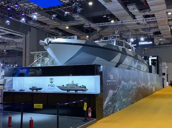 意大利法拉帝FSD195型高速巡逻艇首次离开欧洲来到亚洲,并作为本届进博会首件进馆展品进行布展。11月3日下午,澎湃新闻(www.thepaper.cn)记者前往进博会4.1号馆装备展区探营时看到,这条20米长、5米宽、6.8米高、身披灰白色迷彩服的庞然大物已经布展完毕,法拉帝集团参展方特地提前向澎湃新闻开放了登船参观,令这艘亚洲首秀的公务艇揭开了“庐山真面目”。