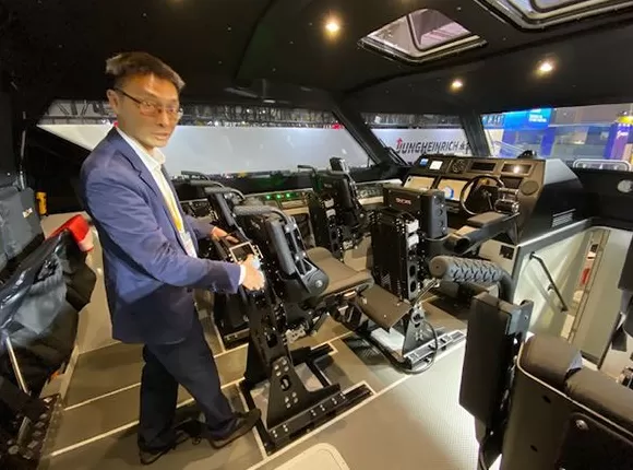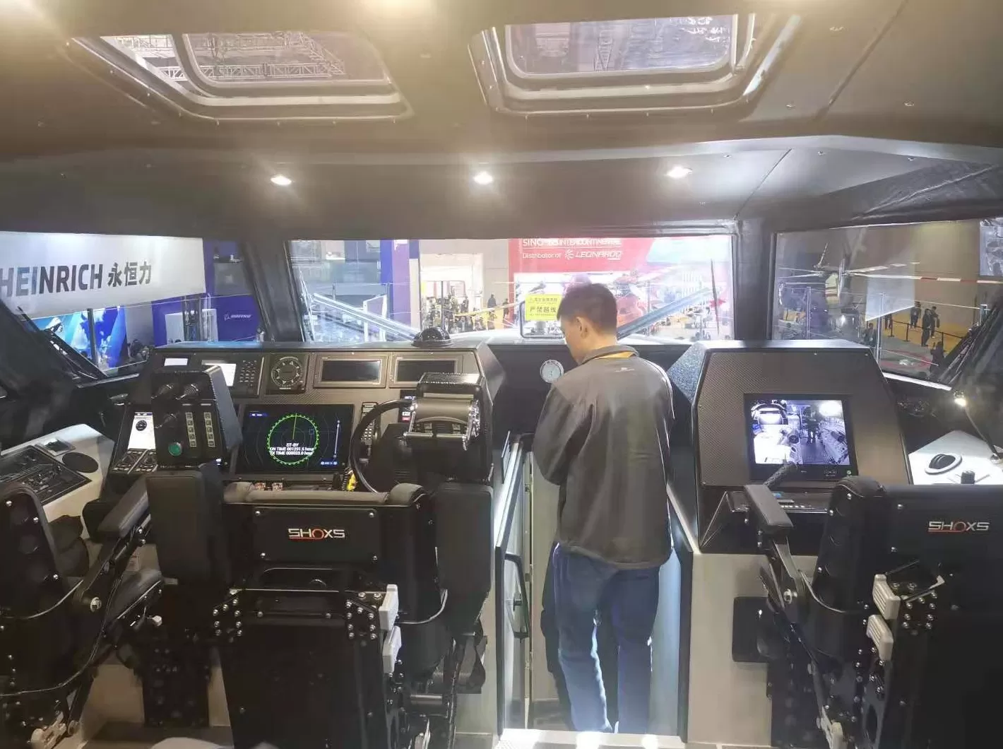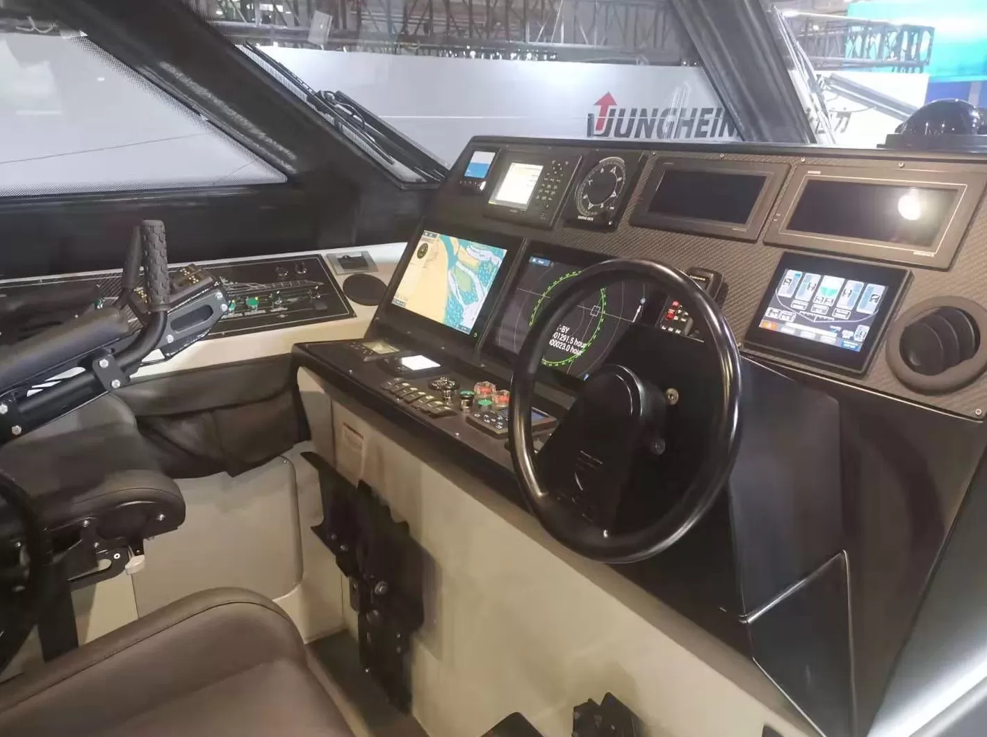 法拉帝集团上海代表处首席代表陈钢告诉澎湃新闻,驾驶舱座椅采用碳纤维和钛金属,具有高科技含量,可以轻松控制前后左右的位置和移动,还可以上下升降调节座椅高度。中间的主驾驶台,通过两边的把手对船加以控制,右边是控制前进和倒退,左边的三个操纵杆是控制船的转向和运动。左边副驾驶台负责看雷达、海图和仪表,右边副驾驶台主要是控制通讯和夜成像仪。