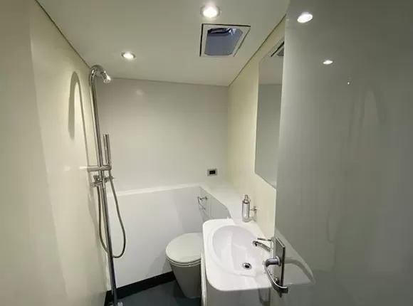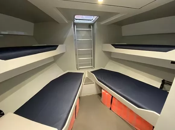 前舱有两个上下铺,且位置错开,可以让下铺的人也能享受到照明和宽阔的视野。床铺前方还有一个紧急逃生出口。