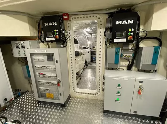 作为心脏部位的机舱,两台1900马力的MAN发动机就位于这里,可以给船提供足够强大的推力。