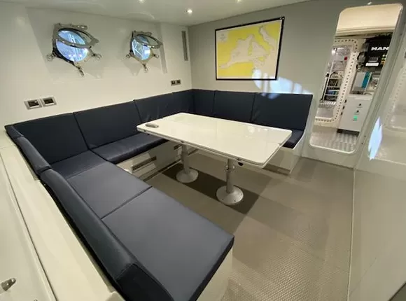 记者看到,驾驶舱下面一层一共设置了四个上下铺,可睡8人。其中,前舱有两个上下铺,根据船头形状和人性化角度,上下铺错开,可以让下铺的人也能享受到照明和宽阔的视野。床铺前方有个逃生舱,遇到紧急情况时可由扶梯快速上到上层甲板。公共区域的会议桌可以当餐桌,需要时可以扩大一倍面积,平时可以节省空间。