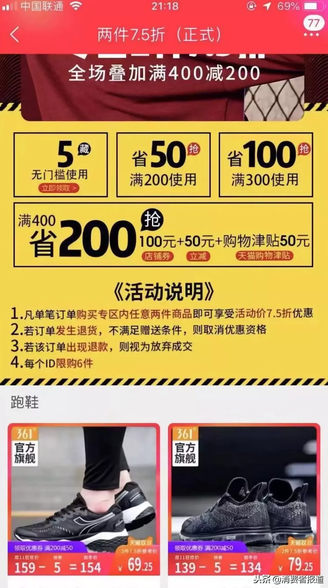 另一名消费者表示,假如购买的7双鞋在双11促销活动时合计实付200余元,退款后专区同品类可换款产品售价较高,让消费者补差价相当于双11购买了7双鞋,退款后只能购买1双或2双鞋。这显然也侵害了消费者的合法正当权益。