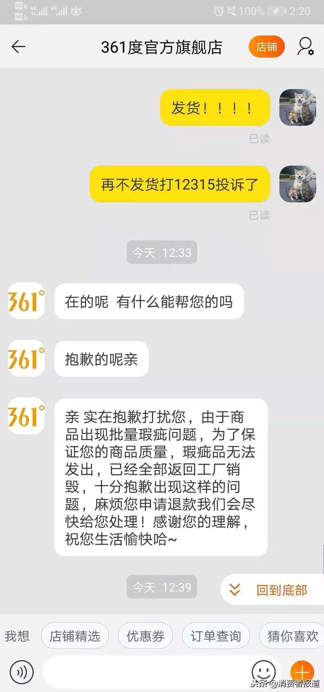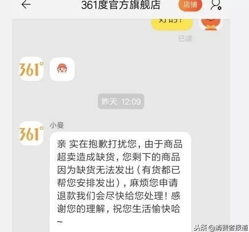据《消费者报道》了解到,这样的遭遇不只是张女士和刘女士。在一个数百人的361度消费者社交平台群聊中,众多消费者双11在天猫361度官方旗舰店购买了促销活动商品,数日后,她们纷纷接到官方店铺客服发来的消息,声称商品缺货、丢失或有瑕疵,不发货并要求消费者申请退款。