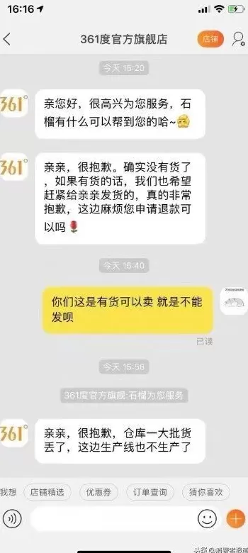 部分消费者在社交平台留言指责361度官方旗舰店利用消费者双11下订单冲高销量,事后以缺货为由不发货且要求退款,虚假促销活动损害了消费者的合法权益,存在欺诈、欺骗消费者的嫌疑,361度欠消费者一个公开道歉。