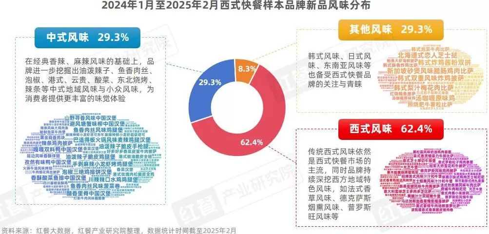 红餐大数据显示,2024年1月至2025年2月,监测的西式快餐样本品牌上新的主食和小吃产品中,西式风味占比最高,为62.4%;其次是中式风味,占比为29.3%;其他诸如韩式、日式、东南亚等风味的产品占比为8.3%。