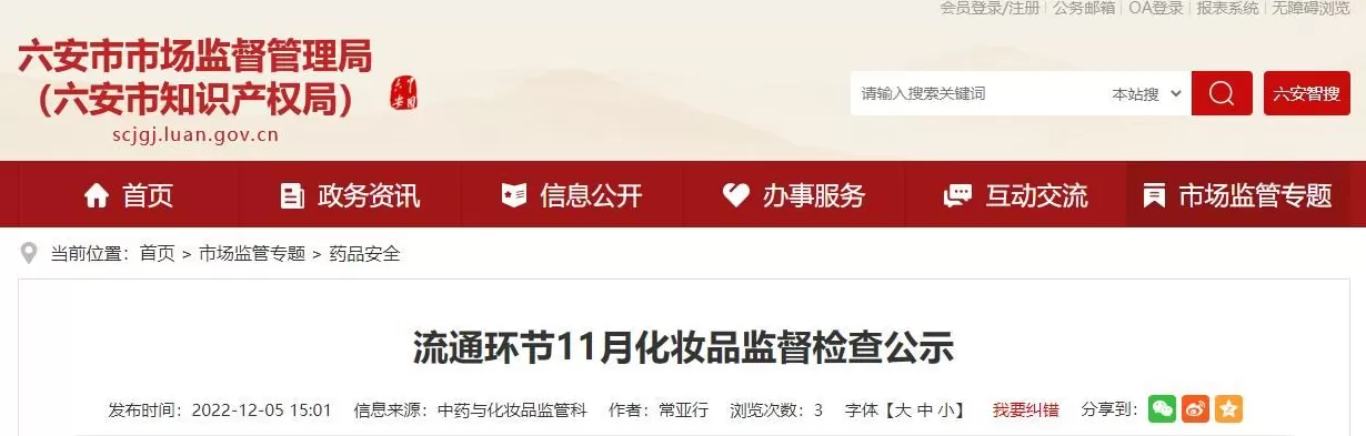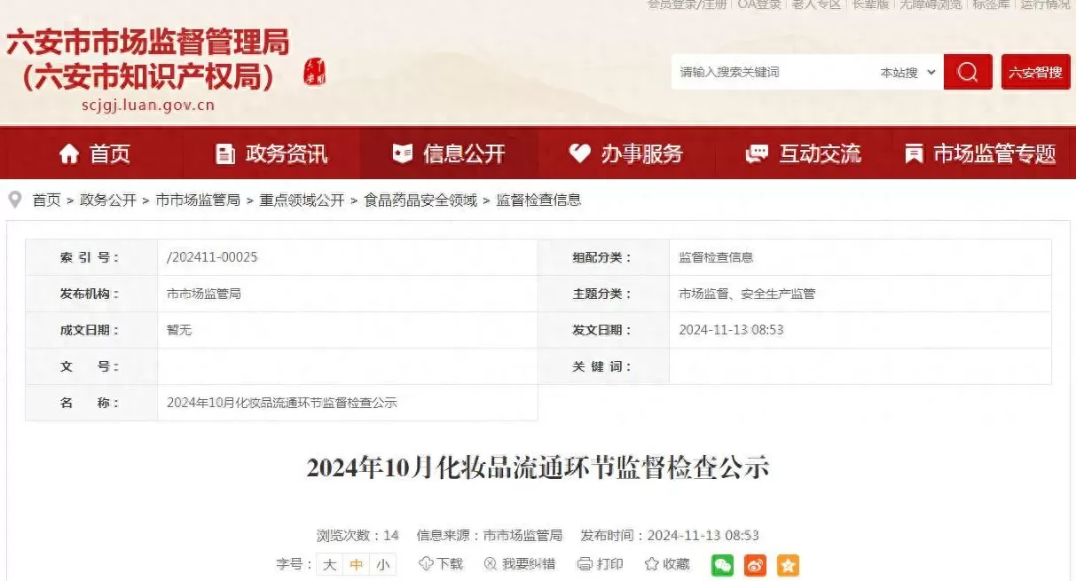 安徽省六安市市场监管局2024年10月化妆品流通环节监督检查公示