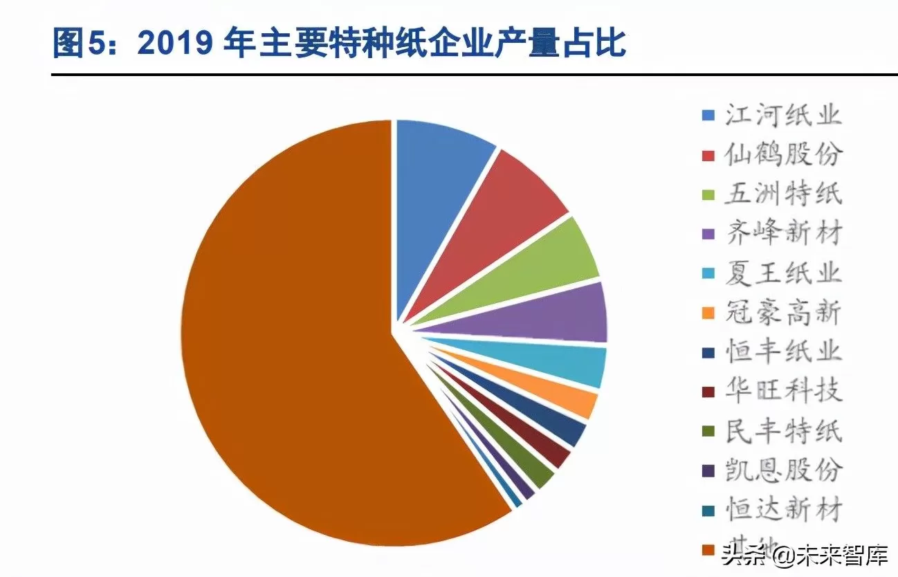 行业竞争格局整体分散,但从细分品种来看集中度较高。2019 年,11 家主要特种纸企业的产量占行业总产 量的 40.46%,集中度相对较低。但是行业整体竞争格局的分散很大程度上是由于特种纸种类众多、单个纸 企覆盖的种类相对有限。从单个纸种来看的话,主要特种纸细分品种(食品包装纸、装饰原纸、格拉辛纸等) 的行业集中度相对较高,我们认为主要是由于单个细分品种市场容量有限,并且行业具备一定技术门槛或者 渠道壁垒。