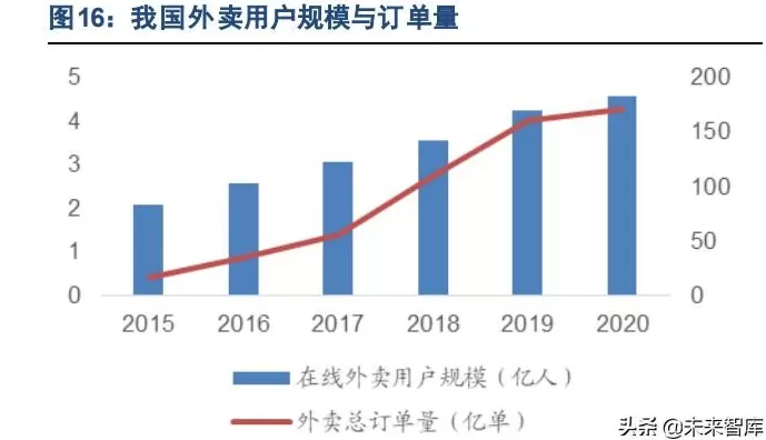 外卖送餐普及,预计市场规模持续增长。随着人们工作生活节奏加快,外卖送餐在国内已逐渐普及,市场规 模逐年增长。2020 年我国网上外卖用户数已达到 4.19 亿人,外卖订单总量达到 171.2 亿单,市场规模达到 6646 亿元。根据弗若斯特沙利文的预测,我国外卖市场规模仍将持续增长,至 2024 年有望达到 12700 亿 元(按交易金额计算),则对应着年均 17.6%的复合增速。