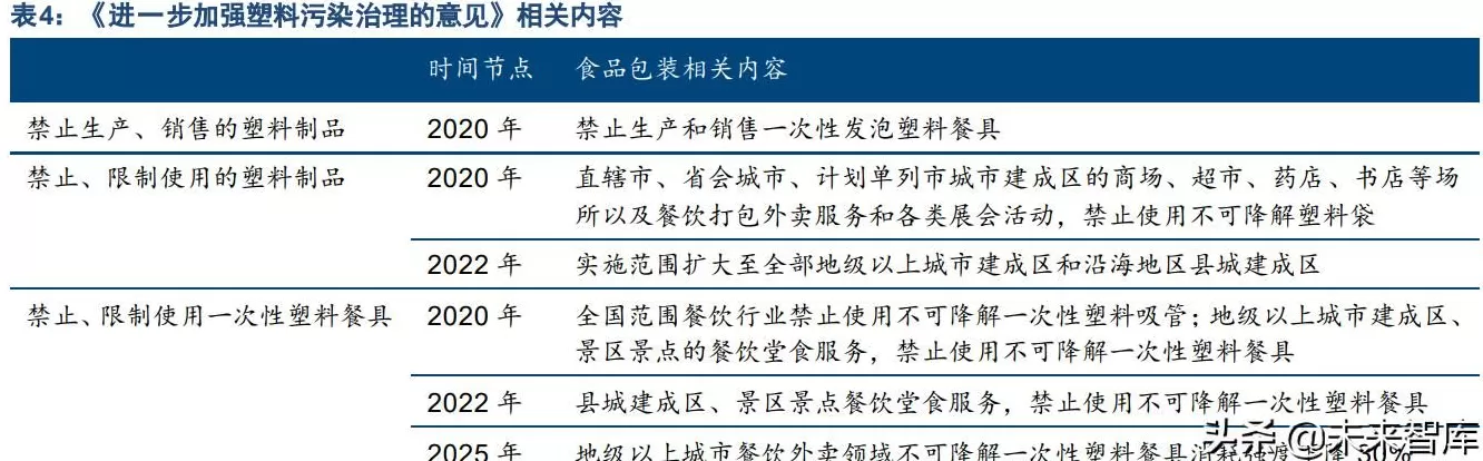 2020 年限塑令推出,食品包装成为限塑重点领域。考虑到不可降解塑料废弃带来的环境污染问题,我国近 年来不断从政策层面推动对不可降解塑料使用的限制和替代。2020 年《关于进一步加强塑料污染治理的意见》 制定了阶段性的“限塑”目标,其中餐饮包装和餐具成为“限塑”重点领域。对于现饮杯子、吸管和外卖打 包餐盒等,纸质容器有望替代其中部分不可降解塑料制品,带来食品包装纸需求的增加。