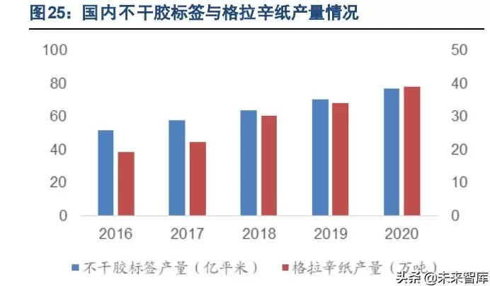 对标发达地区,不干胶标签产量有望持续增长。根据中商产业研究院的数据,2020 年我国不干胶标签产量 77.2 亿平米,三年复合增速 10%。而对标发达地区来看,2020 年我国人均不干胶产量 5.47 平米,相比于欧 洲(7 平米)、北美(10.3 平米)、澳新(11.3 平米)人均不干胶标签使用量(2016 年数据)仍有约 30%-110% 的增长空间。 格拉辛纸作为不干胶标签的主流底纸材料,产量也随之快速增长。2020 年我国格拉辛纸产量 38.9 万吨,三 年复合增速达到 20%。根据五洲特纸的估计,未来格拉辛纸需求增速预计在 15-20%左右。