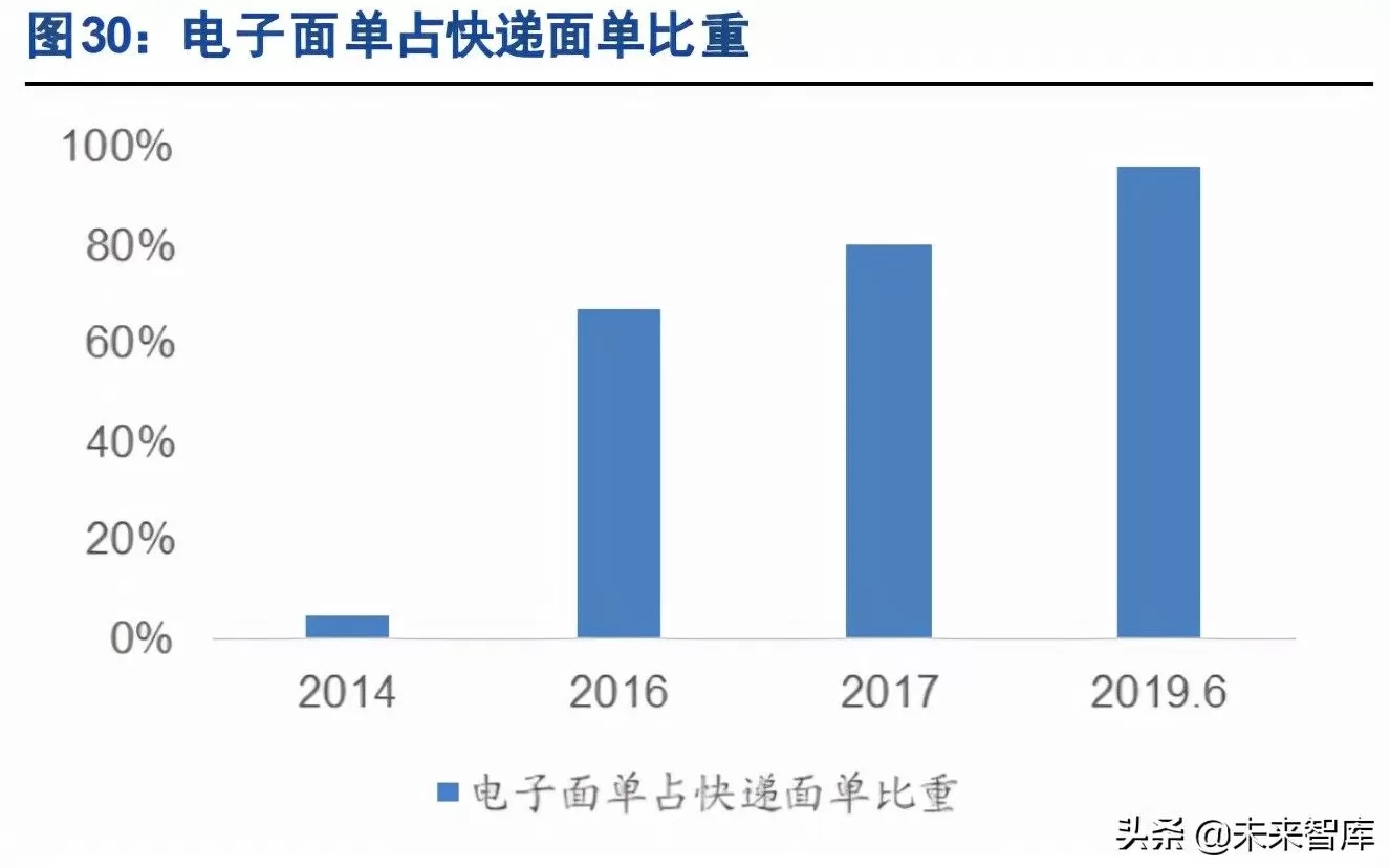 效率与环保因素推动下,快递面单基本实现电子化。相比于早期由客户手工填写的快递运单,电子面单可以 替代人工录入快递物流信息,快递公司使用自动分拣线识别电子面单,能够减少人力成本、提高分拣效率。 同时,相比于四联或五联的快递运单,两联或三联的电子面单(目前已有快递企业采用一联电子面单)可以 降低运单纸张耗材用量。2014 年到 2019 年 6 月,电子面单使用量占快递面单的比例已经从 5%左右上升至 96%左右。