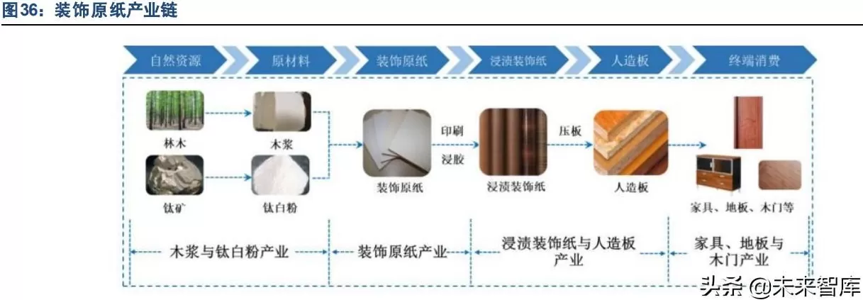装饰原纸:用于增强人造板耐磨度、美观度、防潮度等性能的特种纸,根据用途与特性分为护面表层原纸、 面层装饰原纸、底层平衡原纸和其他装饰原纸,其中用于人造板饰面装饰的面层装饰原纸占比最大。