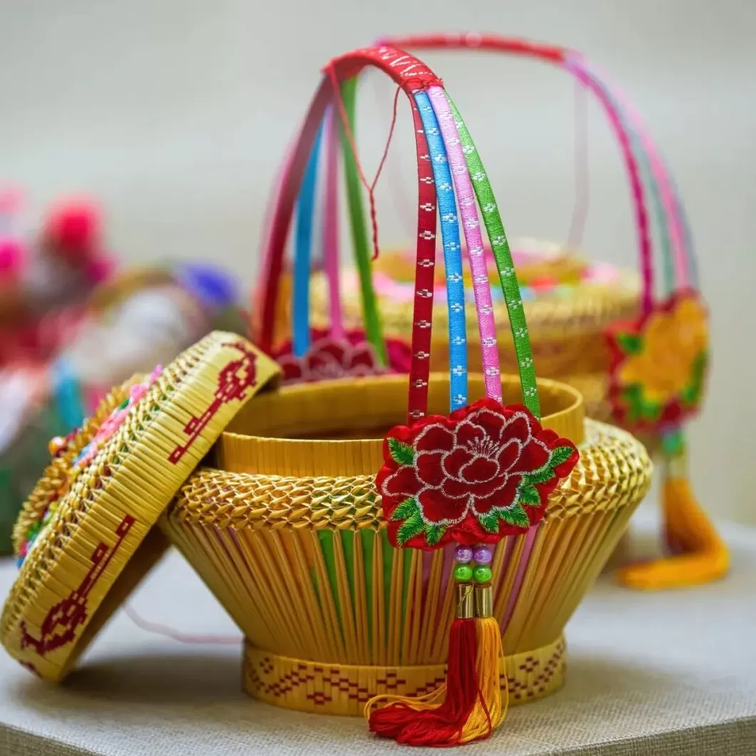 早在明朝 ,德保人就以此珍品作为过节喜庆必备佳礼。洪武元年广西镇安土府岑天保爱花篮如珍宝,并常以此珍品赠送宾客。《德保县志》记载:“花篮,采用麦秆 编织并缀上华丽绸丝而成,造型小巧玲珑。明朝,德保县壮族人民过生日、办婚事等喜庆日子,就有互赠花篮作庆祝的习俗。”