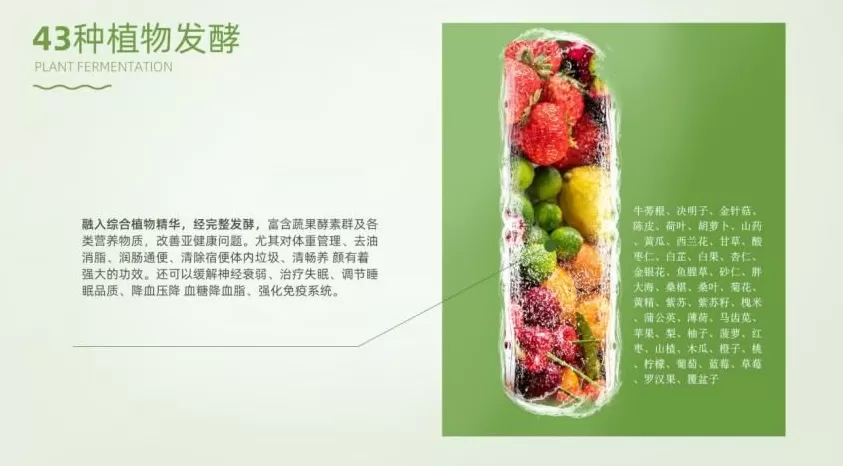 植物复合酵素液(牛蒡根、决明子、金针菇、陈皮、荷叶、胡萝卜、山药、黄瓜、西兰花、甘草、酸枣仁、白芷、白果、杏仁、金银花、鱼腥草、砂仁、胖大海、桑椹、桑叶、菊花、黄精、紫苏、紫苏籽、槐米、蒲公英、薄荷、马齿苋、苹果、梨、柚子、菠萝、红枣、山楂、木瓜、橙子、桃、柠檬、葡萄、蓝莓、草莓、罗汉果、覆盆子)功能:帮助促进肠道蠕动,清热解毒,维持肠道健康。