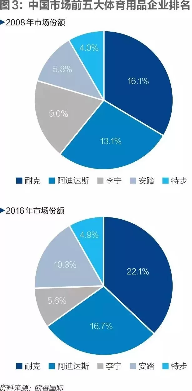 2008年,耐克、阿迪达斯、安踏、李宁(02331.HK)四家公司的中国市场份额之和是44.0%,2016年这一数字已达到54.7%。