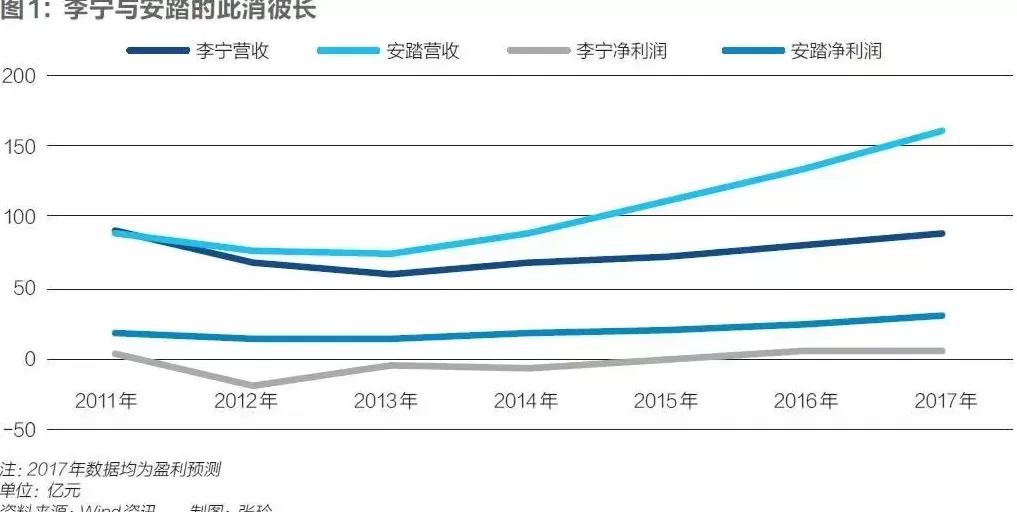 2008年安踏的营收是李宁的69%,2016年是李宁的1.66倍;2008年安踏与特步的营收之差是17亿元,2016年这一数字已扩大至79亿元。
