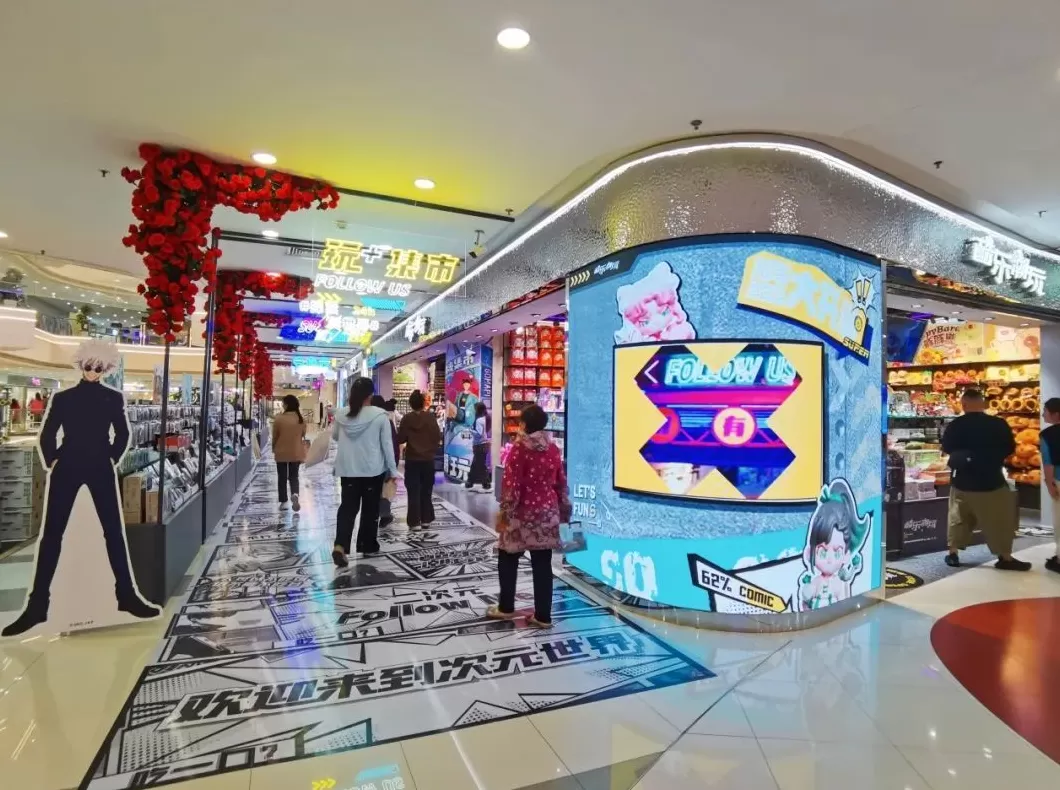 除了商场主导的大型升级外,随品牌入驻而焕新的小型升级也颇具看点。例如,国内潮玩头部品牌酷乐潮玩,新店位于龙之梦3层,店内集聚潮玩、文具、好物,以及多样的国内外IP。门店未来感的设计风格延伸至楼层通道,营造了一处特别的“玩+集市”,犹如一脚踏进了“次元世界”。