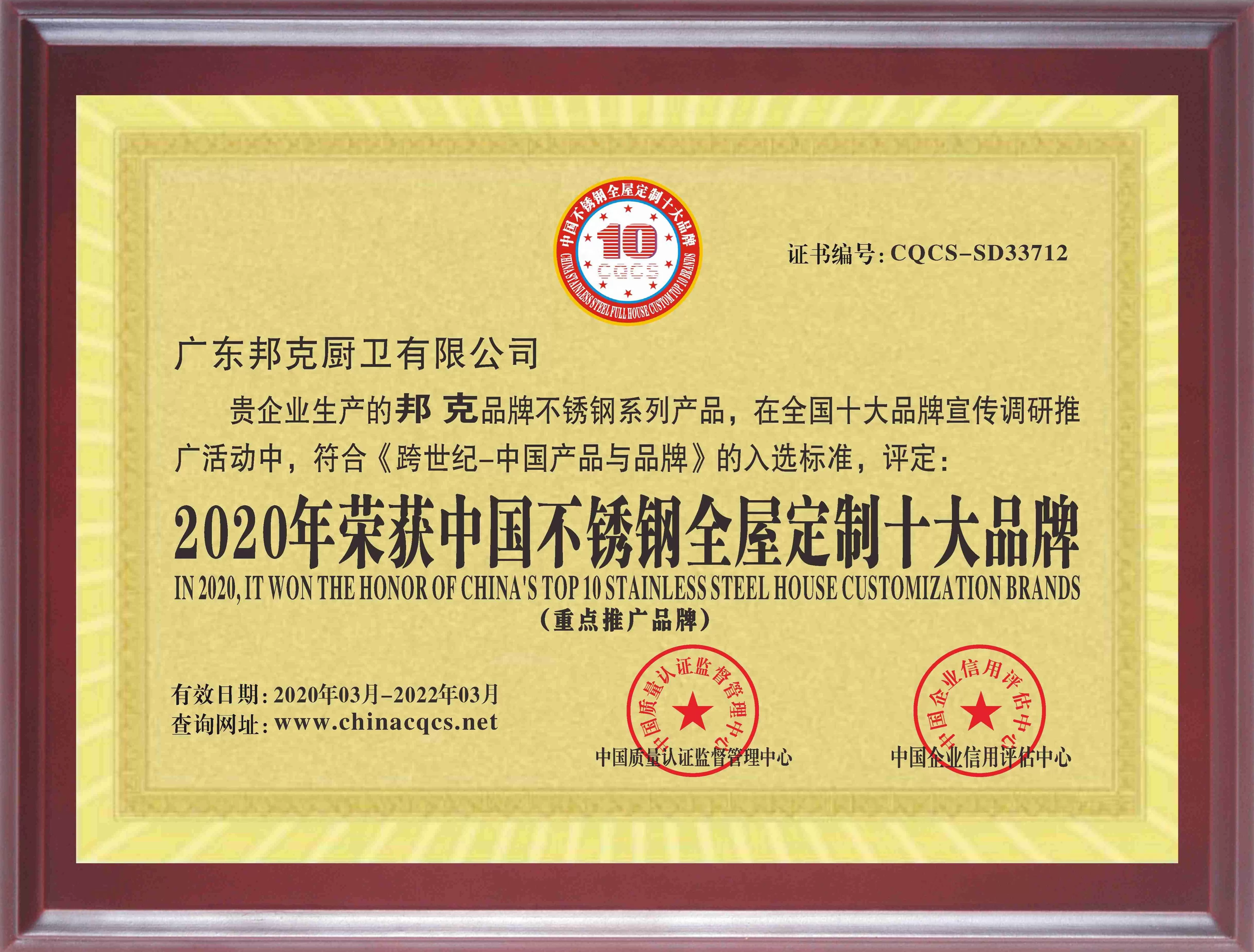 2020年春对于邦克不锈钢全屋定制来说,是扬帆之春,启航之春。在这生意盎然的春,在全国优质品牌调研推广活动中,邦克符合《跨世纪——中国产品与品牌》的入选标准,此外,经综合审核及行业权威信息对比,邦克品牌于环保理念、自主创新、生产技术方面成效显著,荣获“中国质量认证监督管理中心”“中国企业信用评估中心”评估颁发的“中国不锈钢全屋定制十大品牌”称号。
