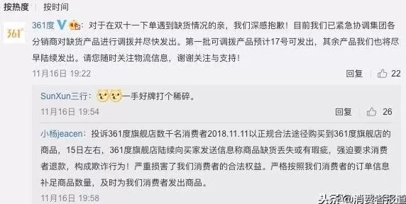 对于天猫361度官方旗舰店双11“缺货门”事件,《消费者报道》也将持续关注。