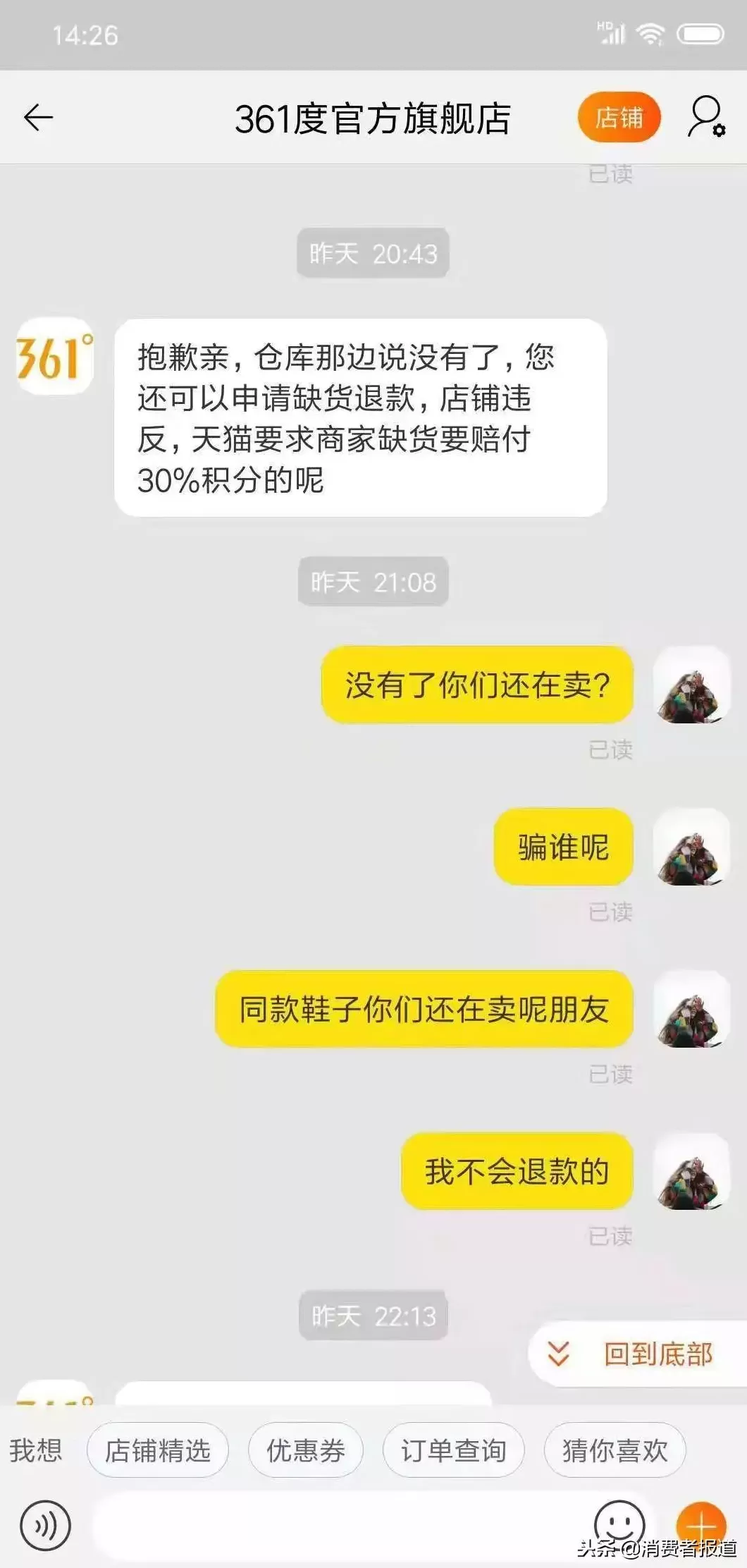 361度官方旗舰店客服在回复一名消费者时称,消费者可以申请缺货退款,如果店铺违约,天猫要求商家缺货要赔付30%的积分。