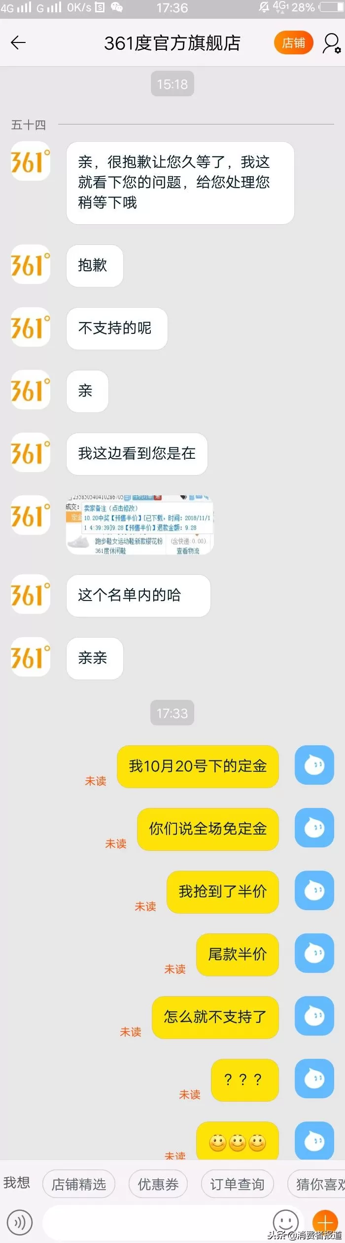 此外,天猫361度官方旗舰店2018年双11前夕还曾推出“免定金尾款半价”预售活动,部分消费者订单中奖并获得免定金、尾款半价资格,但天猫361度官方旗舰店却推脱未履行相应承诺。