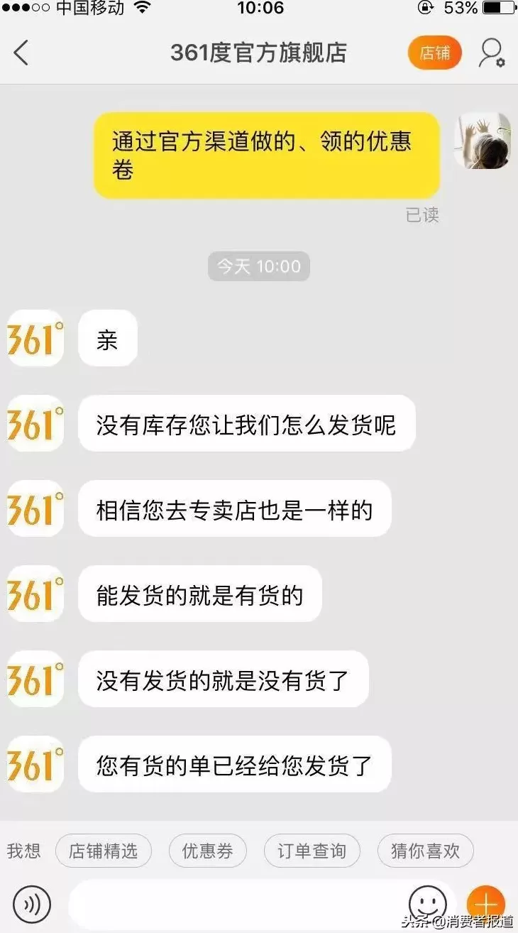 361度加盟店投诉电话 网店仍在售鞋子,天猫361度官方旗舰店却声称无货,不予发货