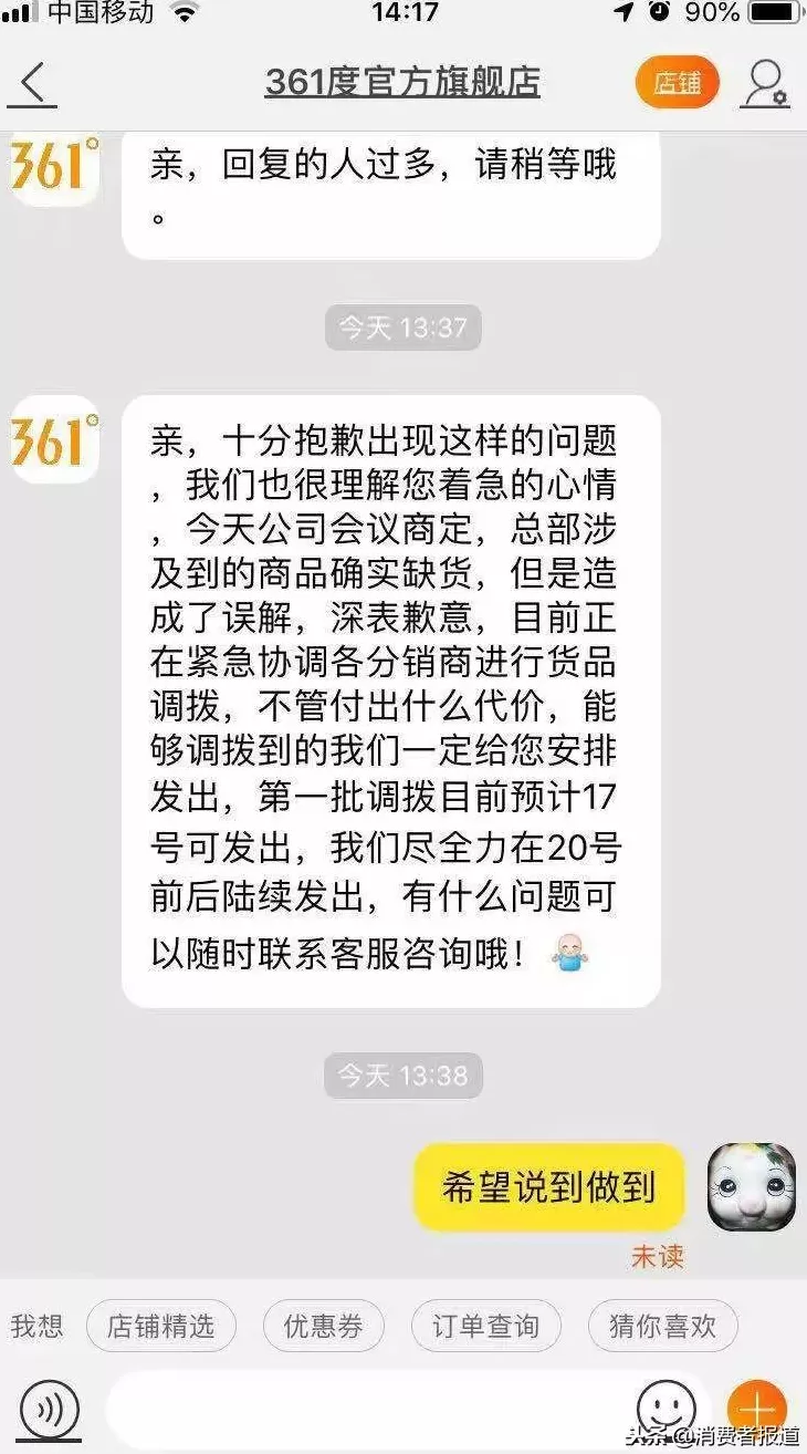 一位宋姓消费者向《消费者报道》表示,11月20日是天猫规定的商家发货期限。另外一名消费者向本刊提供的聊天记录显示,361度官方客服称目前正在紧急协调各分销商进行货品调拨,第一批调拨预计11月17日可发出,尽力在11月20日前后陆续发出。