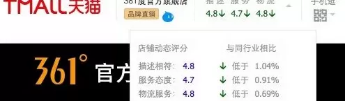 从天猫旗舰店可见,无论是产品描述、服务态度或物流服务,361度均低于同行业平均水平。