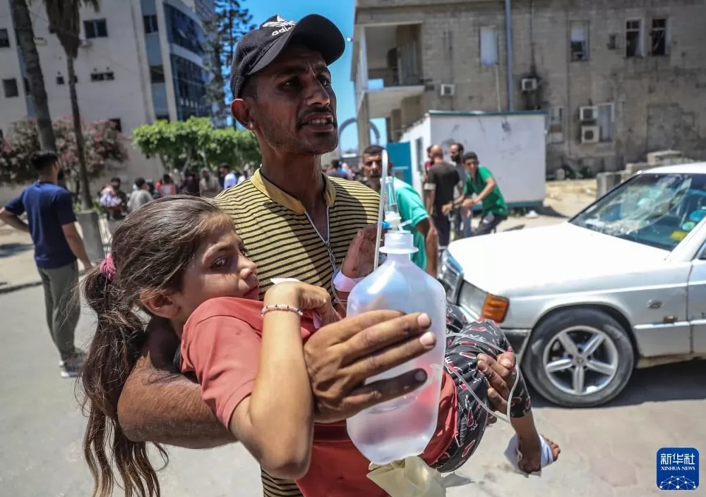 2025年7月13日,在加沙城一所医院,一名男子怀抱在以军空袭中受伤的女孩。新华社发(马哈茂德·扎基摄)