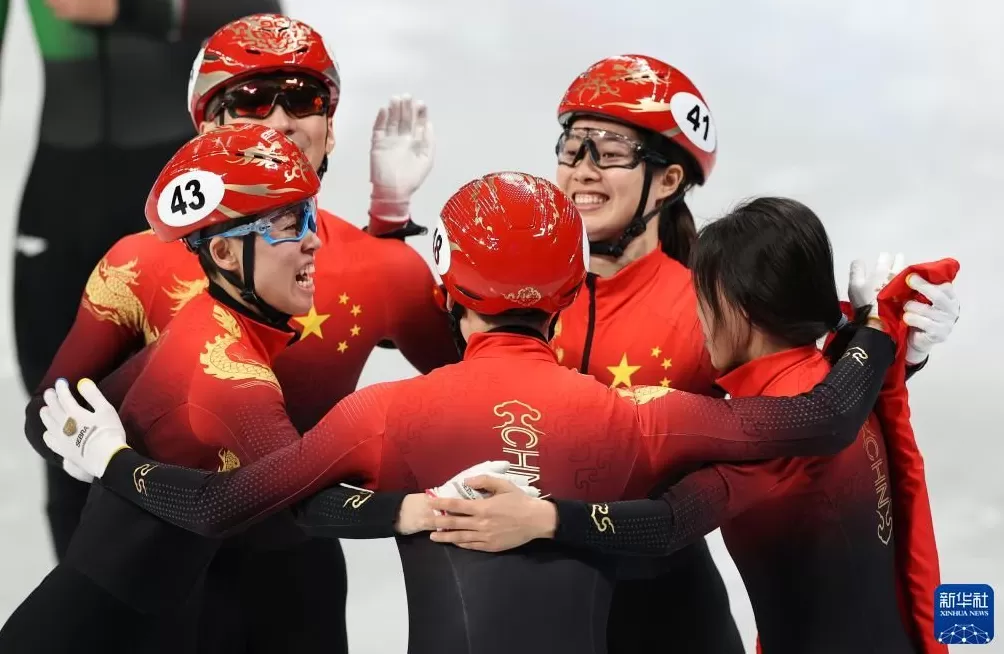 2022年2月5日,在首都体育馆举行的北京2022年冬奥会短道速滑项目混合团体接力决赛中,中国队夺得冠军。这是中国队选手在比赛后庆祝。新华社记者 杨磊 摄