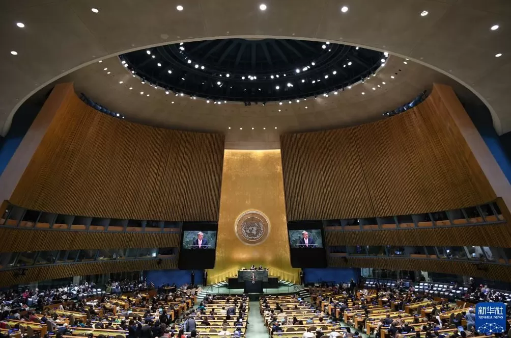 这是2025年9月22日在位于纽约的联合国总部拍摄的联合国大会纪念北京世妇会30周年高级别会议现场。新华社记者 李睿 摄