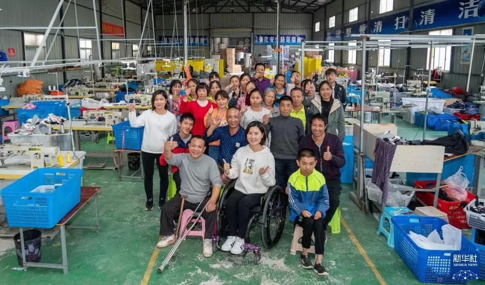 2020年10月13日,在湖南省邵阳市城步县湖南七七科技股份有限公司生产车间,杨淑亭(前排中)与工友合影。新华社记者 才扬 摄
