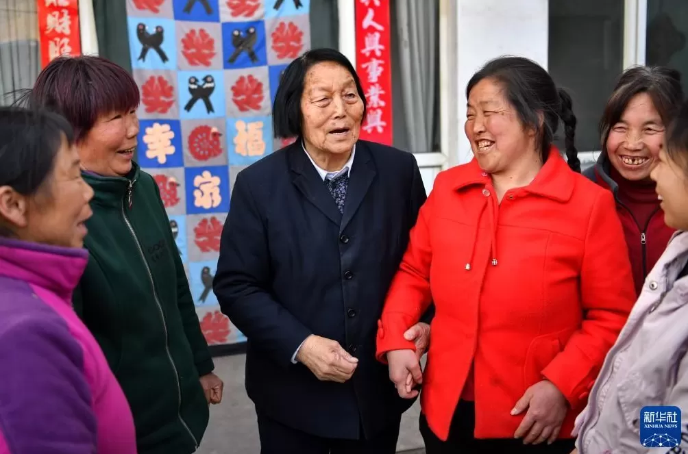 2019年3月23日,申纪兰(左三)在山西省平顺县西沟村与村民分享全国两会精神。新华社记者 曹阳 摄