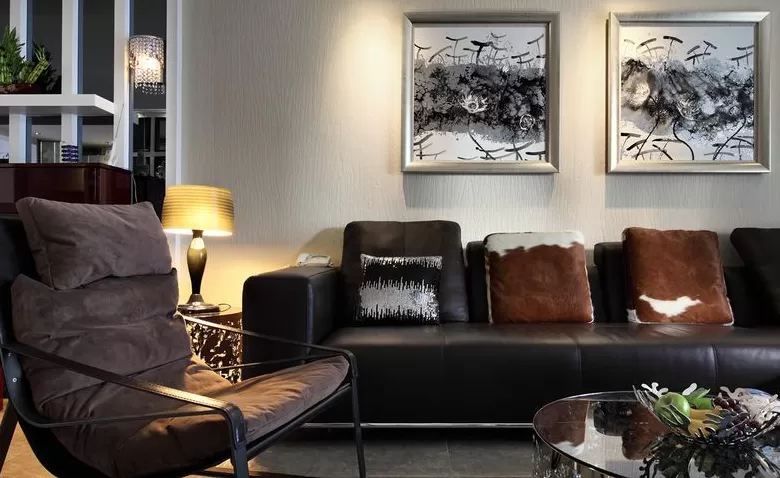 客厅以大块面的壁纸及一色地砖衬映出干净利落的空间,深色皮革沙发与电视柜平衡了客厅的空间感。
