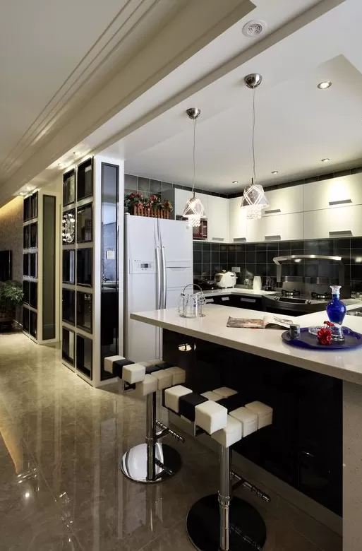厨房为开放式,意德法家的烤漆橱柜与金属砖完美的搭配,将现代风格的质感展现无遗