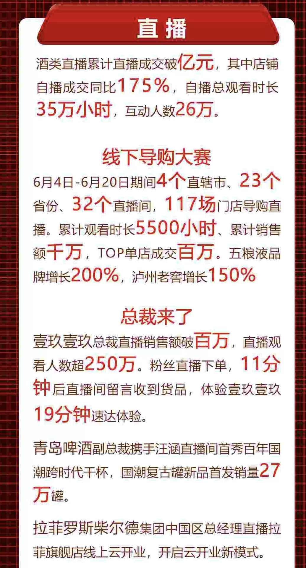 而在这次购物节中,不少酒企的董事长也开始进入直播间,为自己品牌“站台”。6月4日,1919董事长杨陵江在淘宝开启直播首秀;6月15日,汾酒董事长李秋喜走进直播间带货话“梅”酒;6月18日,茅台原董事长季克良在苏宁易购直播间分享茅台故事;6月18日,中粮酒业董事长王浩作为特邀主播在抖音直播带货。