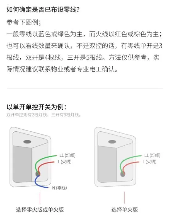 在选购墙壁开关时,需要根据家庭的布线来选购对应规格的产品,一般墙壁开关都是分为单火版和零火版,除非是房屋是自己找人装修的可能会布有零线,大部分精装修房子都是只有火线的,选择单火版本就可以了,不过单火版价格会相对贵点,如果不放心可以咨询物业或者找电工上门更换。