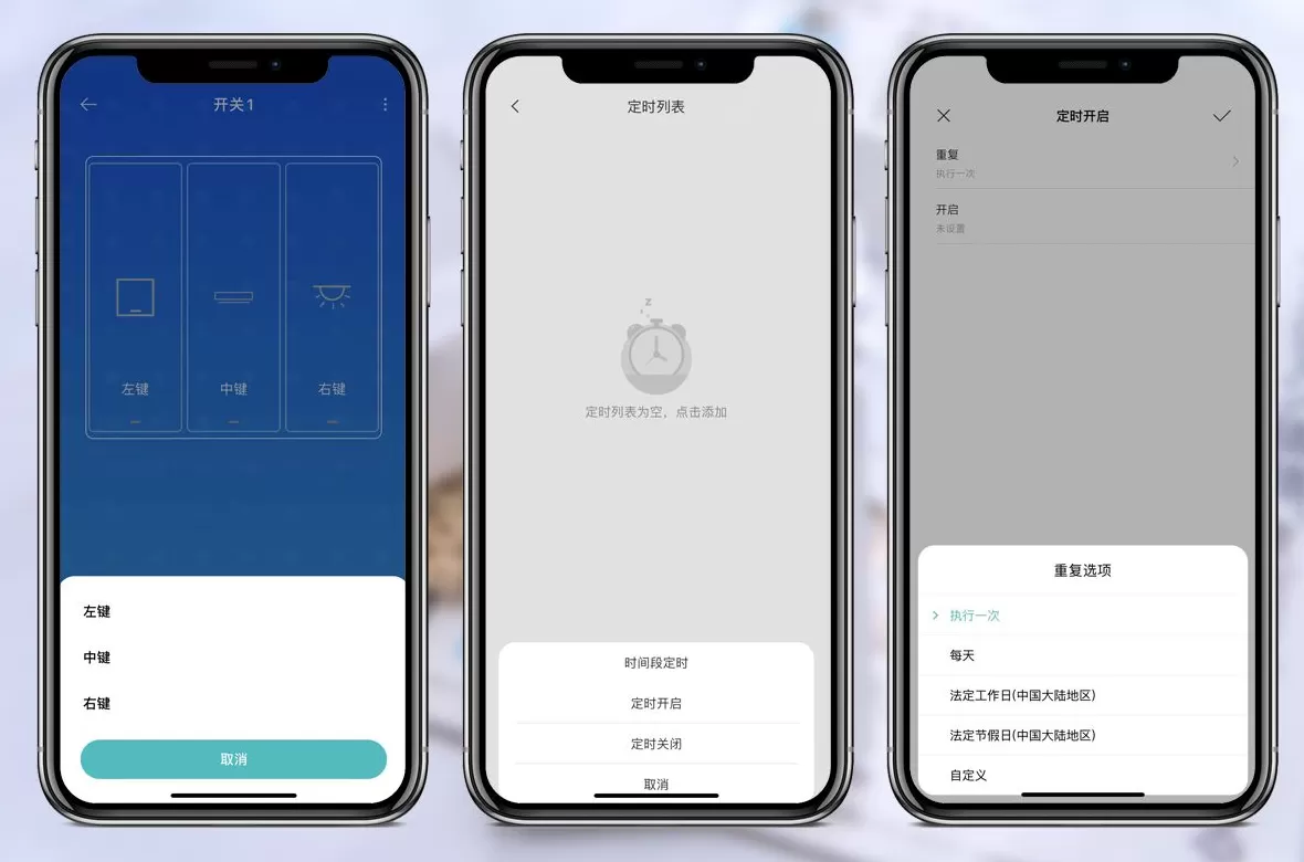 这款智能开关同样支持定时设置,在产品页面选择定时设置,三个键都可单独设置,并且支持时间段定时/定时开启/定时关闭等功能,可以完全满足不同场景应用需求。