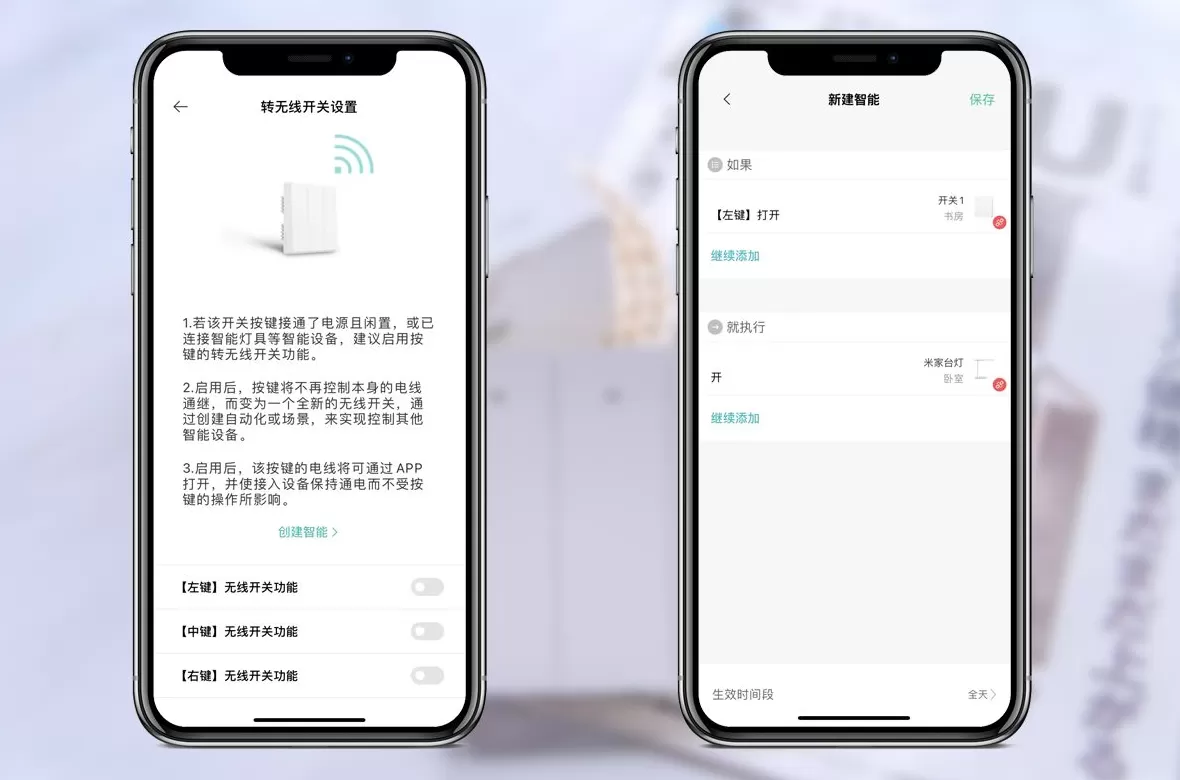除了定时设置外,这款开关还有无线开关功能,可以把闲置的开关按键转为无线开关功能,然后通过创建智能场景来实现控制其他智能设备。