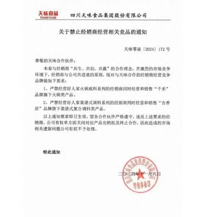 近期,一份天味食品向经销商发布的《关于禁止经销商经营相关竞品的通知》(以下简称“通知”)在网络传开,通知称,严禁经营本公司火锅调料系列的经销商同时经营和销售“千禾”品牌旗下火锅类产品;严禁经营本公司菜谱式调料系列的经销商同时经营和销售“吉香居”品牌旗下菜谱式复合调料类产品。
