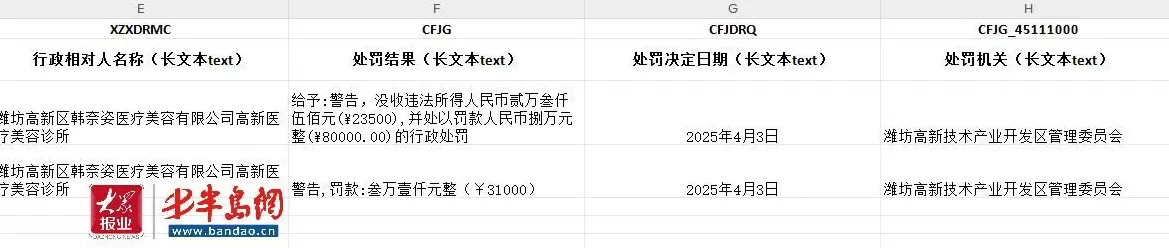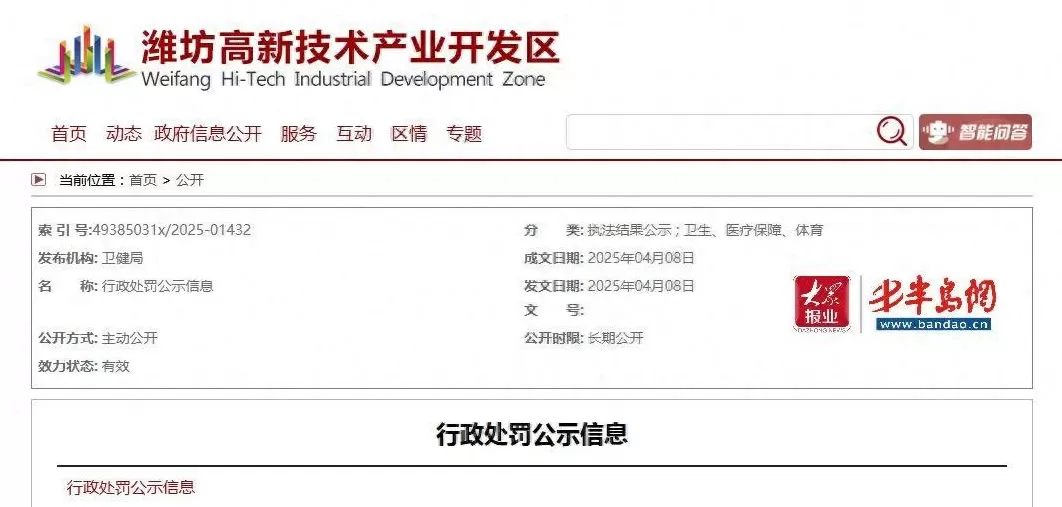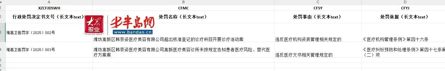 半岛网4月8日讯 4月8日,潍坊高新技术产业开发区网站发布两则行政处罚决定书,文号分别为潍高卫医罚字〔2025〕002号、潍高卫医罚字〔2025〕003号,处罚对象均为潍坊高新区韩奈姿医疗美容有限公司高新医疗美容诊所。因违反医疗相关规定,该美容诊所被给予警告、没收违法所得、罚款等处罚。