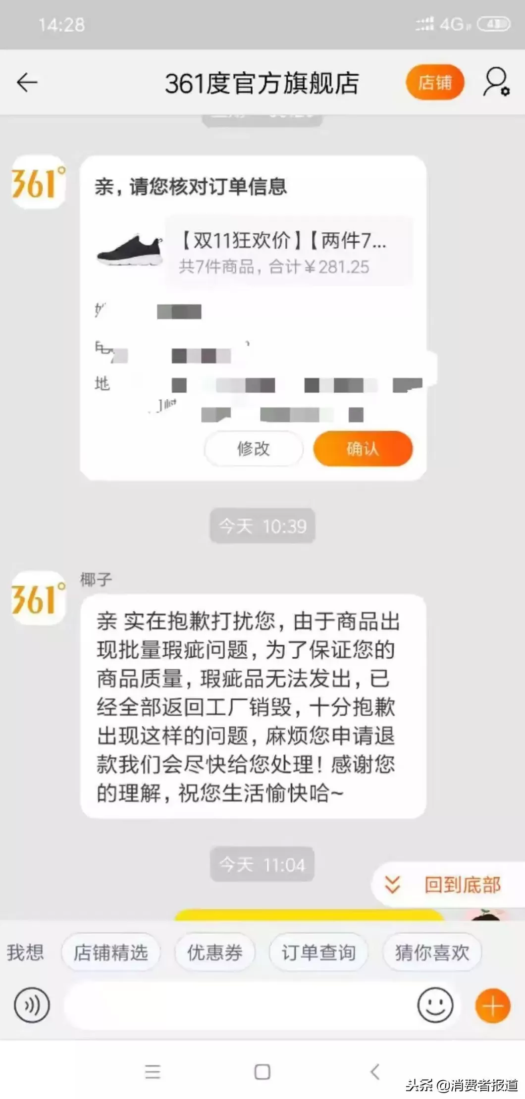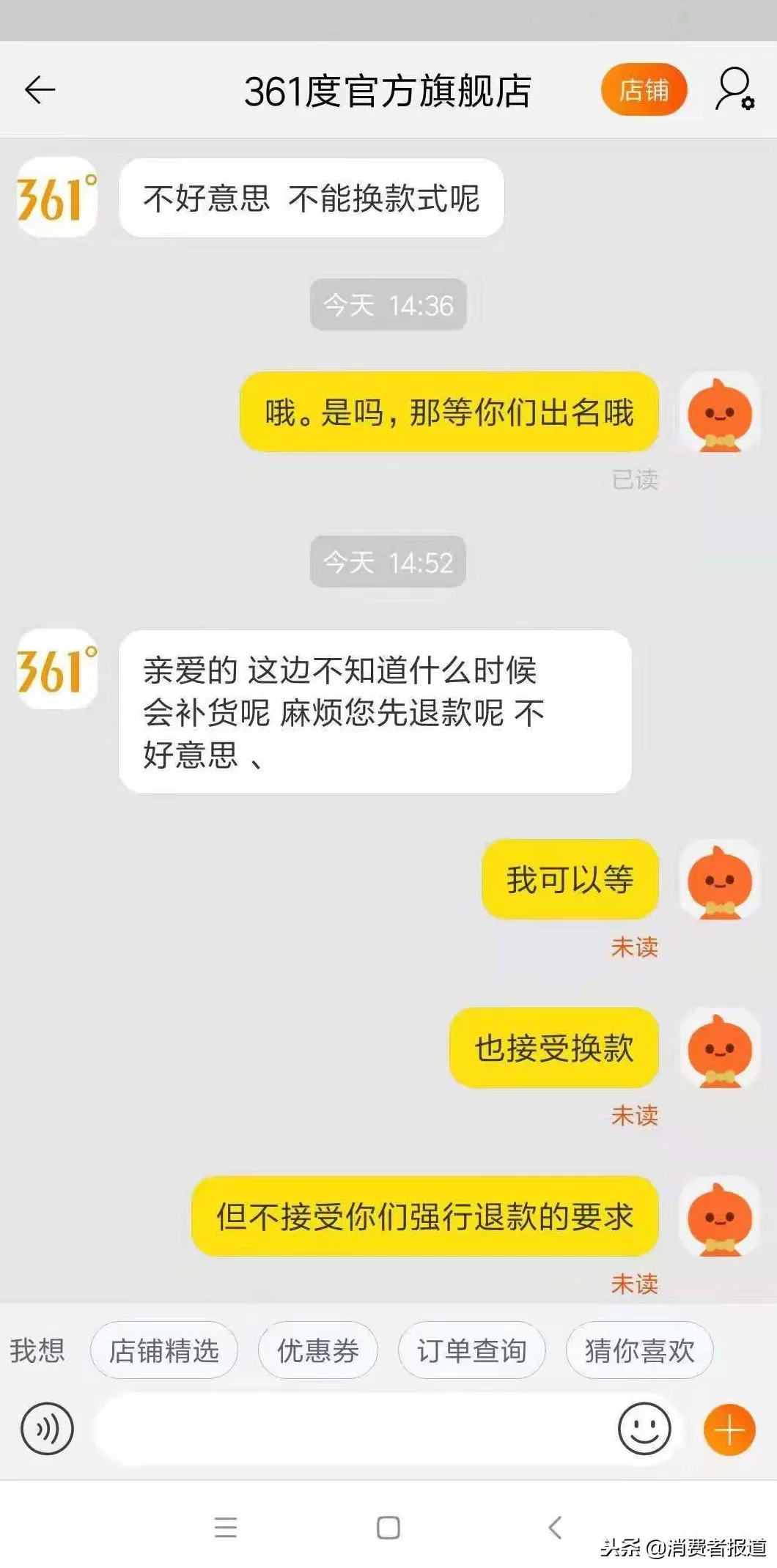 据《消费者报道》了解到,这样的遭遇不只是张女士和刘女士。在一个数百人的361度消费者社交平台群聊中,众多消费者双11在天猫361度官方旗舰店购买了促销活动商品,数日后,她们纷纷接到官方店铺客服发来的消息,声称商品缺货、丢失或有瑕疵,不发货并要求消费者申请退款。