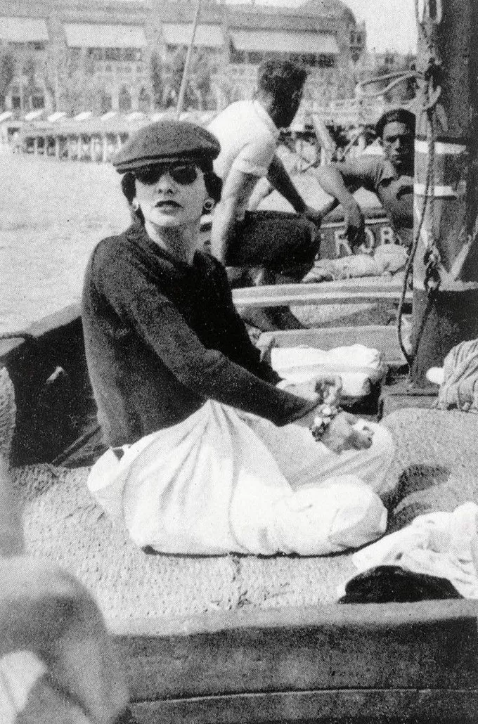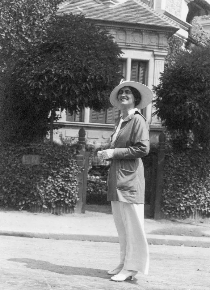 在杜维埃,香奈儿首次运用jersey针织面料创作服装;也是在杜维埃,她对优雅且实用的男装产生了浓厚的兴趣。她的灵感源泉来自卡柏男孩的衣橱、赛马场马夫与马球手的制服、渔夫身着的服装,甚至连会把裙裾吹起的海风都带给她诸多启发。