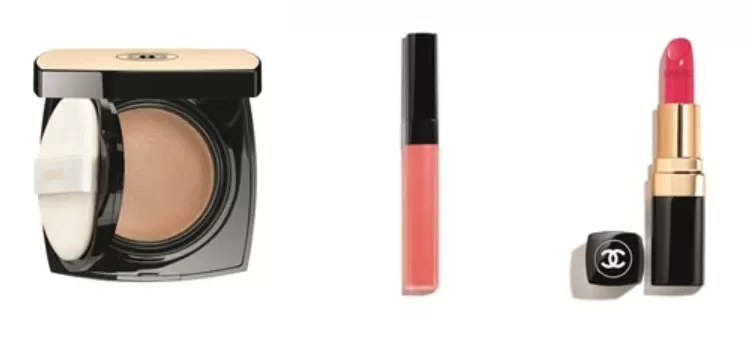 从左至右依次为:CHANEL气垫水粉底 SPF 25 / PA+++;CHANEL可可小姐唇颊蜜#410少女心;CHANEL可可小姐唇膏#482淘气
