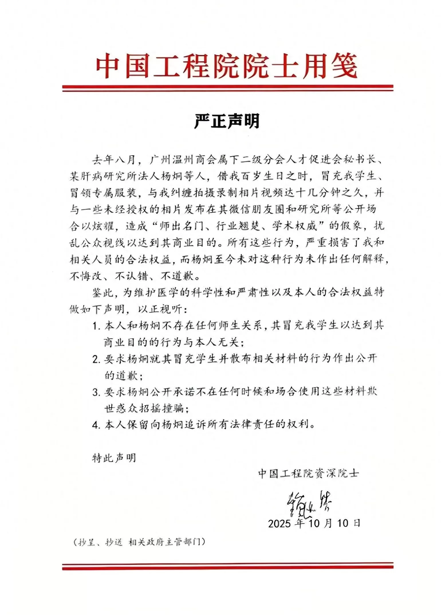 10月11日,一份由百岁院士手书签字并委托发布的“严正声明”,将一场“冒用师门、蹭合影”的争议推至台前。